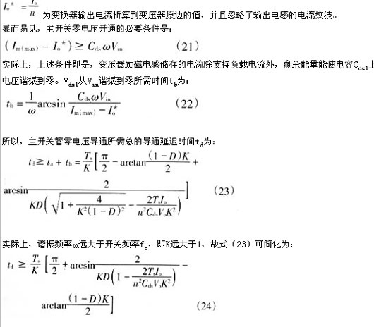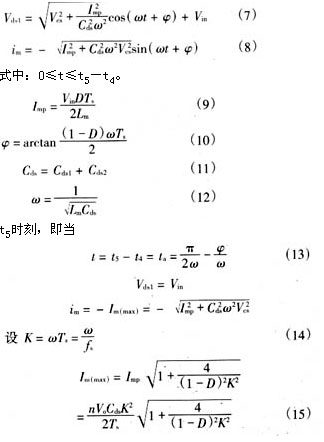 從上面的分析可明顯地看出,當(dāng)變壓器勵磁電感l(wèi)m減小,勵磁電流足夠大時,[t5~t0′]期間勵磁電流除了能提供負(fù)載電流外,剩余部分可用來幫助電容cds2、cds1充放電。電壓vds1有可能諧振到零,從而實現(xiàn)主功率開關(guān)管s的零電壓軟開通。二極管d1可為負(fù)的勵磁電流續(xù)流。關(guān)鍵工作波形如圖2(b)所示,具體的軟開關(guān)條件將在下一節(jié)中詳細(xì)討論。很顯然,軟開關(guān)的代價是變壓器勵磁電流和開關(guān)管導(dǎo)通電流峰值大幅增加,開關(guān)管及變壓器電流應(yīng)力和通態(tài)損耗明顯加大。