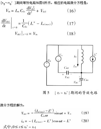 當(dāng)輔助開關(guān)sa斷開后,由于磁飽和電感l(wèi)s瞬間相當(dāng)于開路,因此變壓器勵磁電流可完全用來對cds2和cds1充放電。[t4~t5]、[t5~t0′]期間,等效電路同圖4。顯然,令式(21)和(24)中io*或io為零,即可得到主開關(guān)管零電壓導(dǎo)通的能量條件和時間條件,im(max)≥cdsωvin,即: