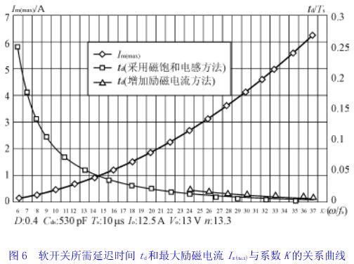 死區(qū)延遲時間,意味著pwm變換器有效占空比的損失。為了盡量減小有效占空比的損失,則k必須加大。另一方面,變換器開關(guān)頻率fs愈高,則為保持相同的有效占空比,k至少應(yīng)保持不變,即諧振頻率ω應(yīng)與開關(guān)頻率fs成比例增加。圖6給出了軟開關(guān)所需要的死區(qū)時間td和最大勵磁電流im(max)與k的關(guān)系曲線。從圖中明顯看出,采用加大勵磁電流的方法實現(xiàn)零電壓軟開關(guān)和采用磁飽和電感器比較,要求的k較大,因而有較大的勵磁電流損耗;另外,從式(15)看出,開關(guān)頻率愈高,電流峰值也愈高,變壓器的銅耗和開關(guān)管的導(dǎo)通損耗也愈大。因此,軟開關(guān)有源鉗位正激變換器工作頻率不宜太高。