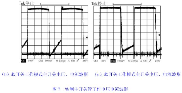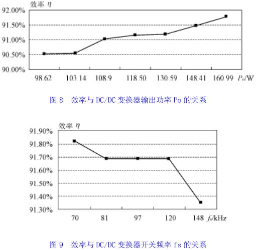 圖7(a)、7(b)、7(c)給出了實測的主開關(guān)管工作電壓、電流波形。圖7(a)顯示主開關(guān)管工作在硬開關(guān)狀態(tài)。圖7(b)和圖7(c)分別是采用增加勵磁電流方法和應(yīng)用磁飽和電感器方法實現(xiàn)零電壓軟開關(guān)的電壓電流波形,后者明顯地降低了勵磁電流和開關(guān)管電流的峰值。實測波形與理論分析完全一致。圖8、9顯示出了實測的效率曲線。從圖9中看出,當(dāng)變換器開關(guān)頻率增加時,變壓器勵磁電流損耗和開關(guān)管通態(tài)損耗所占比重增加,變換器效率降低了。實驗結(jié)果驗證了理論分析。