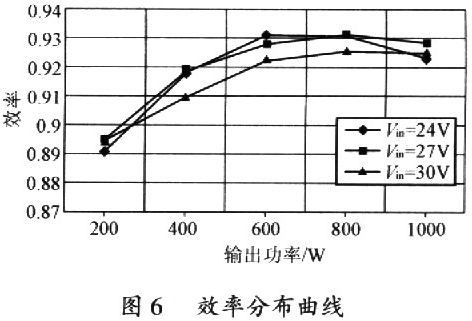圖6為該變換器在24V、27V、30V輸入時(shí)對(duì)應(yīng)不同輸出功率的的效率分布曲線(xiàn)圖。其中輸入電壓為24V,輸出功率600W時(shí)最高效率可達(dá)93.1%,27V滿(mǎn)載1 000W時(shí)效率為92.8%。