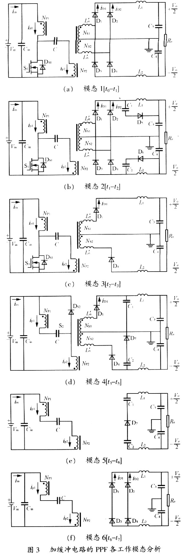 圖2為加無(wú)損緩沖吸收的PPF電路工作原理波形圖,一共分為14個(gè)工作模態(tài)。