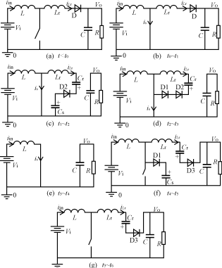 子電路包括一個(gè)電感Lr,兩個(gè)電容Cs、Cr,三個(gè)二極管D1、D2和D3。Lr提供主開關(guān)零電流開通條件,限制二極管D的反向恢復(fù)電流。電容Cs提供開關(guān)零電壓關(guān)斷條件。電容Cr為電感Lr能量恢復(fù)提供能量。這種變換器有七種運(yùn)行模態(tài)。假設(shè)各種元器件為理想元器件,且Cs<Cr。下面對其進(jìn)行分析。