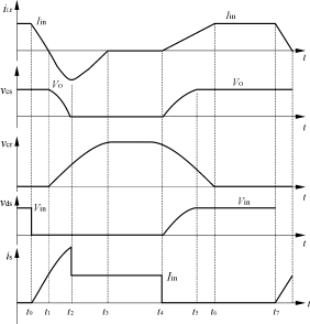 從t5開始,vcs被鉗在VO,即VCsmax=VO;電源繼續(xù)經(jīng)L,Lr,Cr,D3向負(fù)載供電,電容Cr繼續(xù)放電。t=t6時(shí),電容電壓vcr降到零,同時(shí)電感電流iLr上升到Iin,iLr=Iin,簡化電路如圖2(g)所示,波形圖如圖3所示。