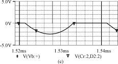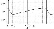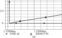 由圖4可知,當(dāng)開關(guān)導(dǎo)通時(shí),開關(guān)電壓V(M1:d)(Vds)下降,由于電感Lr的作用,電流不能突變,使得開關(guān)電流is在開關(guān)電壓V(M1:d)(Vds)降到零后,才從零開始上升,實(shí)現(xiàn)了開關(guān)的零電流導(dǎo)通。當(dāng)開關(guān)關(guān)斷時(shí),由于電容Cs的鉗壓作用,開關(guān)電壓從低電壓上升,基本實(shí)現(xiàn)零電壓關(guān)斷。而電感電流iLr和電壓vcr波形與理論分析的是一致的。