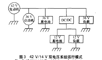 雙電壓系統(tǒng)將汽車電器與電控裝置根據(jù)耗電量的大小分為兩組,傳統(tǒng)的中小功率用電器為一組,如燈具、儀表、電動雨刷等采用14V電源供電;而大功率用電器如發(fā)動機控制單元、加熱、電動懸架等電器則直接采用42V的電源供電。交流發(fā)電機經(jīng)整流調(diào)壓后得到42V電壓供給高功率負載并對36V蓄電池充電,而42V電壓經(jīng)DC/DC變換器之后為14V電氣系統(tǒng)供電。