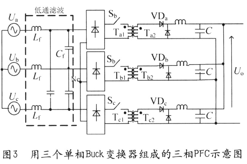 圖3用三個單相Buck變換器組成的三相PFC示意圖,圖3所示Buck型電路的結(jié)構(gòu)比較簡單,同全橋電路相似,由于隔離變壓器反射電壓的影響,其相對于反激電路來說也有較大的電流失真,但其諧波仍可以限定在比較低水平,達(dá)到IEC—1000的要求。另外,其可實現(xiàn)的功率等級的大小不如全橋高,但比反激式電路要大。