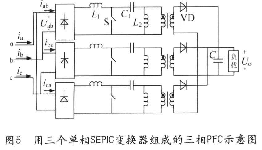 在Boost變換中,傳統(tǒng)的隔離在此種情況下的應(yīng)用并不理想,因為在電流連續(xù)情況下,器件將產(chǎn)生高的電壓應(yīng)力,在電流斷續(xù)情況下將產(chǎn)生較大的輸入電流失真。圖5所示的電路是用隔離SEPIC電路組成的三相PFC電路,SEPIC變換器的輸入端類似于Boost電路,因此具有Boost電路的優(yōu)點,如有低的輸入電流失真和更小的EMI濾波器。在輸出端SEPIC電路像反激式變換器,從而不必以增加電壓為代價達(dá)到隔離的作用。