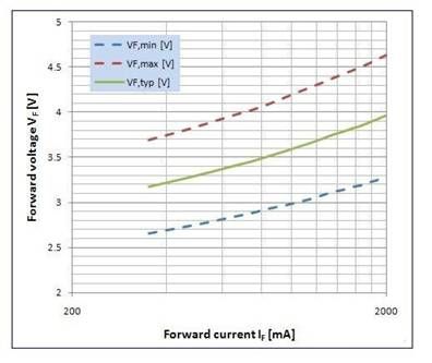 移動電話中閃光燈 LED 的高正向電壓和電流以及給定的電池電壓,讓升壓轉(zhuǎn)換器成為最佳的解決方案。驅(qū)動大電流時,基于電感的升壓轉(zhuǎn)換器呈現(xiàn)出令人滿意的效率。LED必須為電流驅(qū)動,因為正向電壓不僅僅隨溫度而變化,而且也有其自身的差異。正向電壓的這種變化源自于其生產(chǎn)過程,其變化范圍為 ±20%,請參見圖 1。
