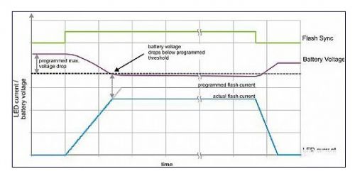 TI 擁有一種監(jiān)控電池電壓的閃光燈驅(qū)動器技術(shù)。要獲得穩(wěn)定的 LED 電流波形并且避免過多的電池壓降,閃光燈驅(qū)動器要主動控制 LED 電流上升/下降順序。在上升階段(上升斜率為 25mA/12?s),要對輸入電壓進行監(jiān)控。如果輸入電壓降至某個設(shè)定閾值以下,則器件即刻停止讓 LED 電流進一步上升至該設(shè)定閾值,并將閃光燈電流保持在實際電平,參見圖 5。