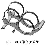 ( 2) 氫氣罐保護(hù)。高壓氫氣罐的固定支架和鋼帶應(yīng)有足夠的強度,以保證在碰撞過程中,高壓氫氣罐的動態(tài)位移不會太大,避免造成連接管路的斷裂、變形和氫氣的大量泄漏。何?。?3]基于顯式有限元理論,按照 CMVDR294 法規(guī)對國內(nèi)自主開發(fā)的某燃料電池轎車進(jìn)行正面碰撞分析,對比分析兩種氫氣罐保護(hù)系統(tǒng)設(shè)計方案的計算結(jié)果,提出了安全有效的氫氣罐保護(hù)方案,即氫氣罐保護(hù)系統(tǒng)采用整體式設(shè)計。如圖 2 所示,氫氣罐框架通過 3 根橫梁和 2 根縱梁將兩個氫氣罐集成到一個框架總成。縱梁截面為“Π”形,由幾塊板材拼焊而成,中部設(shè)計出兩個圓弧形凹槽,可以對氫氣罐進(jìn)行有效的固定和保護(hù)。