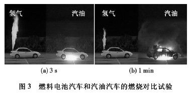 邁阿密大學(xué)的 MICHAEL[15]分別對燃料電池汽車和汽油汽車的燃燒進(jìn)行對比試驗,將兩輛汽車分別用氫氣和汽油做燃料,然后做泄漏點火試驗,如圖 3 所示。點火 3 s 后,高壓氫氣產(chǎn)生的火焰直噴上方,而汽油由于比空氣重,則從汽車的下部著火。到 1 min 時,氫氣作燃料的汽車只有漏出的氫氣在燃燒,汽車沒有大問題; 而汽油車則早已成為一個大火球,完全燒光。這說明氫氣汽車比現(xiàn)在普遍使用的汽油車安全得多。