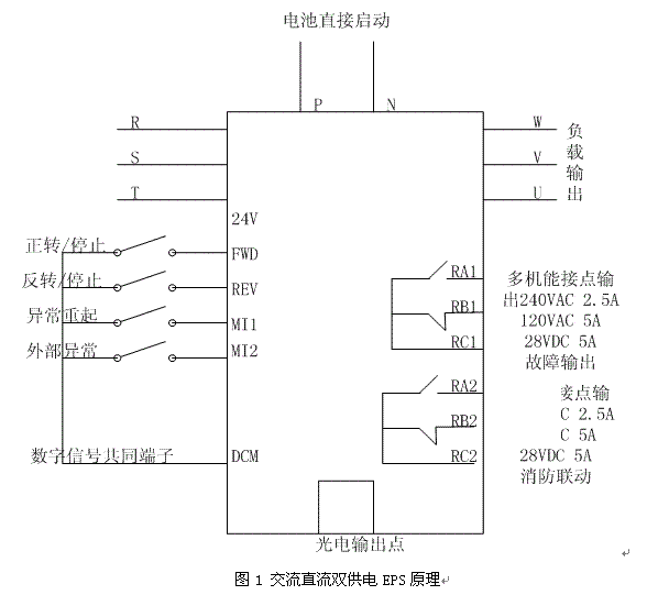 目前EPS采用的控制方式和控制手段不同,針對EPS所帶的負載可以歸納三種:一是主要用于應(yīng)急照明和事故照明的EPS;二是除了應(yīng)急照明、事故照明之外,還有應(yīng)用于空調(diào)、電梯、卷簾門、排氣風(fēng)機、水泵等混合負載的三相系列EPS;三是直接給電動機供電的變頻系列EPS。本文介紹的是最全面的混合負載三相系列EPS供電。