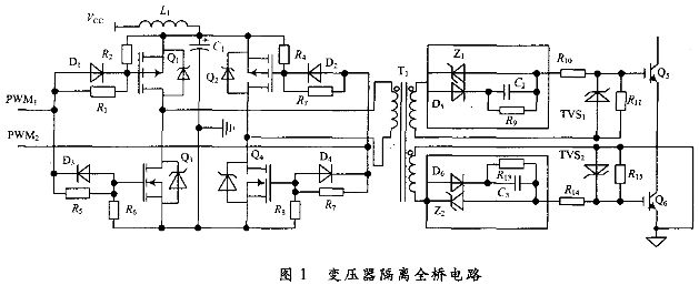 在中頻脈沖滲碳電源中,能快速進(jìn)行過(guò)流保護(hù)是至關(guān)重要的,而驅(qū)動(dòng)脈沖無(wú)延遲地傳輸,對(duì)實(shí)時(shí)過(guò)流保護(hù)起至關(guān)重要作用;同時(shí)為了減少開(kāi)關(guān)損耗,還要求很陡的驅(qū)動(dòng)脈沖上升沿和下降沿;一些特殊場(chǎng)合要求緊湊而簡(jiǎn)潔、不附加驅(qū)動(dòng)電源等。綜合考慮以上要求,采用變壓器隔離全橋驅(qū)動(dòng)電路,其電路如圖1所示。