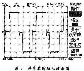 由圖3和圖4比較可以看出,在較小延時(shí)的情況下,應(yīng)把尖峰減到最小。從圖3可以看出,要減小的尖峰主要是負(fù)脈沖后沿的過(guò)沖尖峰,因?yàn)檫@個(gè)尖峰極有可能達(dá)到IGBT的開(kāi)啟電壓(Vth),這樣就會(huì)造成同一橋臂的兩個(gè)IGBT直通;同時(shí)由圖5可以看出,在滿負(fù)載(600 V/30 A)狀態(tài)下,驅(qū)動(dòng)波形具有很好的穩(wěn)定性,而且沒(méi)有大的尖峰,這就保證了IGBT穩(wěn)定、安全的工作。