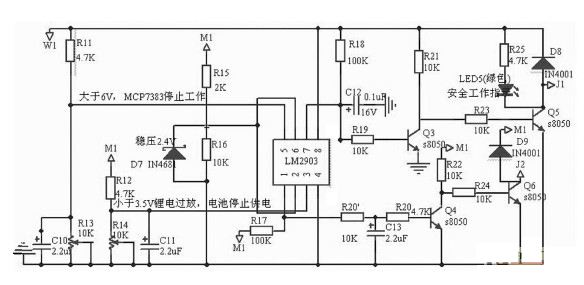 過電壓保護(hù)控制,具體電路如圖3所示:整流二極管D4 接過電壓保護(hù)繼電器JDQ1輸出。 充電控制管理芯片MCP73831最大輸入電壓為6V. 雖然供電網(wǎng)絡(luò)基本輸出電壓為5V,但當(dāng)光照強(qiáng)度發(fā)生劇烈變化或負(fù)載變化較大時,輸出電壓仍然會有一定波動,為保護(hù)MCP73831不因短時的電壓波動而損壞,設(shè)計(jì)了過電壓保護(hù)控制器。 當(dāng)W1 的電壓超過6V, JDQ 1會斷開輸出電路,MCP73831因斷電而得到保護(hù)。 具體分析如下:此部分電路設(shè)計(jì)主要采用了LM 2903電壓比較器和外圍電路擴(kuò)展而成。 LM 2903包含兩路比較器,1, 2, 3腳為一路, 1腳為OU TPU TA, 2, 3腳為IN PU TA. 5, 6, 7腳為另一路, 7腳為OU TPU TB, 5, 6腳為IN PU TB. 其中過電壓保護(hù)控制器用5, 6, 7腳的比較器。電阻R11 , R13分壓后接至比較器的5腳。 當(dāng)電壓大于6V 即分壓值大于214V. 比較器的7腳輸出電平由低轉(zhuǎn)為高。 Q3 飽和導(dǎo)通,則Q5 截止,安全工作指示燈熄滅,接點(diǎn)J1為高電平,此時JDQ 1開始工作,供電電路與后續(xù)電路斷開,同時過電壓紅色警示燈亮起。