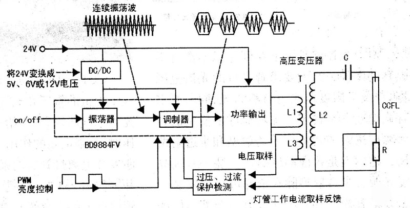 加電后,當(dāng)背光燈驅(qū)動(dòng)板收到CPU送來的“ON”信號(hào)(常見為高電平啟動(dòng),多為3V~5V)后,控制振蕩器開始工作,產(chǎn)生頻率為30kHz~lOOkHz的振蕩信號(hào)送入調(diào)制器內(nèi)部,對(duì)CPU送來的PWM亮度調(diào)節(jié)信號(hào)進(jìn)行調(diào)制,調(diào)制后輸出斷續(xù)的30kHz~lOOkHz激勵(lì)信號(hào)驅(qū)動(dòng)功率輸出電路,經(jīng)高壓變壓器升壓后輸出高壓并點(diǎn)亮背光燈管。