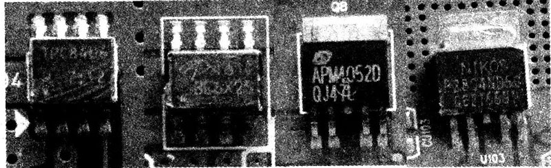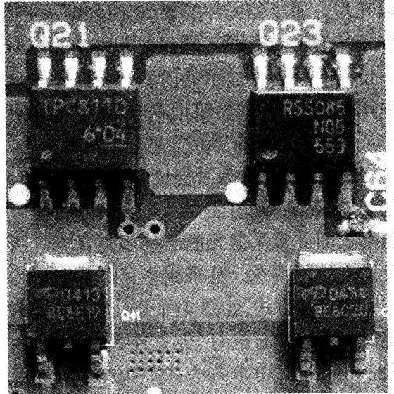 背光燈驅(qū)動(dòng)板主要由振蕩器、調(diào)制器、功率輸出電路及保護(hù)檢測(cè)電路組成,如1圖所示。在實(shí)際電路中,除功率輸出部分和檢測(cè)保護(hù)部分外,振蕩器、調(diào)制器及控制部分通常由一塊單片集成電路完成,這類集成電路常用的主要有BD(Rohm公司生產(chǎn),如BD9884FV、BD9766等)及OZ系列(凹凸微電子公司生產(chǎn),如02960、02964等);功率輸出管多采用互補(bǔ)的功率型場(chǎng)效應(yīng)管,有的采用3腳和8腳(①~③腳為S極,④腳為G極,⑤-⑧腳為D極)貼片封裝型,常見型號(hào)有D454、RSS085、D413、TPC8110、FDD6635.FDD6637等,如圖2所示;還有的采用由N溝道和P溝道組合的5腳或8腳MOSFET功率塊(①腳為Sl極,②腳為Gl極,③腳為S2極,④腳為G2極,⑤~⑧腳為D1、D2極),如SP8M3、TPC8406、4614、APM40520、P2804ND5G等,如圖3所示。保護(hù)檢測(cè)多由集成電路10393、358、393或LM324及其外圍元件來完成。輸出電路主要由高壓變壓器、諧振電容及背光燈管組成,并設(shè)有輸出電壓、輸出電流取樣電路?!?/p>