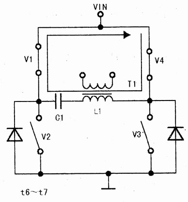 在t6~t7期間,V1、V4導(dǎo)通,V2、V3截止,L1與C1諧振,Ll中儲(chǔ)存的電能通過V1、V4給C1充電,流過L1的電流逐漸減小,其電流回路如圖20所示。