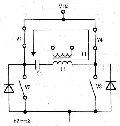 在t2~t3期間,V1、V4導(dǎo)通,V2、V3截止,L1與Cl諧振,Ll中儲(chǔ)存的電能通過Vl、V4給C1充電,流過Ll的電流逐漸減小,其電流回路如圖16所示。