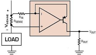 為了克服這些電流檢測(cè)難題,人們創(chuàng)造了高端電流檢測(cè)放大器。這些特殊放大器用來(lái)從高共模電壓中抽取通過(guò)小檢測(cè)電阻的電流產(chǎn)生的小差分電壓。然后,檢測(cè)電壓被放大并被轉(zhuǎn)換成以地為基準(zhǔn)的信號(hào)。圖 5 顯示了高端電流檢測(cè)放大器的基本拓?fù)?。在這個(gè)圖中,放大器給 RIN 加上等于 VSENSE 的電壓。然后,通過(guò) RIN 的電流流過(guò) ROUT,提供以地為基準(zhǔn)的輸出電壓。就這個(gè)基本功能而言,很明顯,高端電流檢測(cè)放大器應(yīng)該有高輸入阻抗、高增益和高增益準(zhǔn)確度、以及寬共模范圍和良好的共模抑制。也許不那么明顯的是還有放大器精確度的重要性。