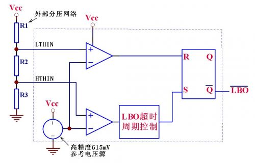 IC內(nèi)含一個(gè)高精度的615mV基準(zhǔn)電壓源、兩個(gè)比較器、一個(gè)RS觸發(fā)器和其它一些邏輯電路,其大致功能是:VCC電壓或其它待檢測電壓通過R1-R3組成的分壓網(wǎng)絡(luò)接在IC的LTHIN /HTHIN檢測引腳,當(dāng)待測電壓下降導(dǎo)致LTHIN引腳低于615mV時(shí),輸出腳LBO輸出低電平,而如果待測電壓上升導(dǎo)致HTHIN引腳高于615 mV時(shí),經(jīng)過內(nèi)部邏輯判斷和簡單延時(shí)后,輸出腳LBO輸出高電平。