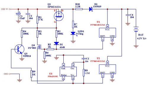 乍看之下,這個(gè)方案采用了三個(gè)IC,可是U1和U2是采用的SOT-23或者TO-92封裝,就好像普通三極管一樣,其價(jià)格也就是2-3個(gè)三極管的價(jià)格,而U3(PT8A2513NE)也是采用的TO-94封裝,外形和三極管很相似,價(jià)錢也相當(dāng)便宜,不過,這個(gè)電路可以實(shí)現(xiàn)智能判斷電池是否過放電,決定是否在開始充電時(shí)采用小電流預(yù)充,另外,采用U3后也將充電后期的補(bǔ)充充電過程延長到大約一個(gè)小時(shí)!
