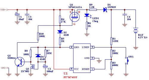 其工作流程大致是:當(dāng)接上Li+電池和供電電源時(shí),IC通過R1/R2/R3組成的網(wǎng)絡(luò)檢測電池電壓,如果電池電壓低于3.3V(由R1-R3的電阻值決定),或者按下按制SW1,此時(shí)IC3腳的電壓低于615mV,則IC4腳輸出低電平,通過R5/D2拉低Q1的柵極使之導(dǎo)通,從而通過Q1/R9/D1給電池進(jìn)行大電流充電,當(dāng)電池電壓一路上升直至超過4.20V,此時(shí)IC的1腳電壓高過615mV,IC內(nèi)部經(jīng)簡單判斷和延時(shí),令4腳輸出高電平,從而關(guān)閉大電流充電通道,但是4腳的高電平同時(shí)給R7/C2的充電回路供電,令到Q3的柵極電壓慢慢升高,并給R8提供通路導(dǎo)致Q2導(dǎo)通,通過R10給Q1提供一個(gè)較弱的導(dǎo)通電流,使之微微導(dǎo)通,從而為電池提供一個(gè)較少的補(bǔ)充充電電流。按照?qǐng)D中所示元件參數(shù)將于大約十分鐘后,由于C2的不斷充電,其端電壓即Q3的柵極電壓不斷上升直至使Q3導(dǎo)通,從而關(guān)閉Q2,令到整個(gè)充電過程結(jié)束。