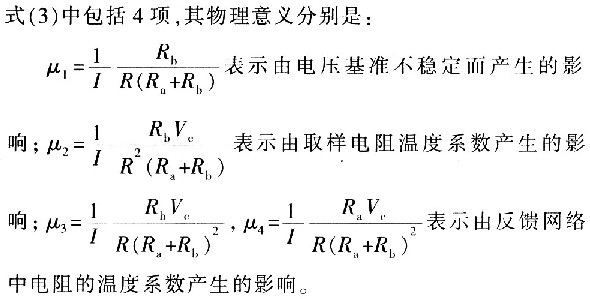 由于選取的取樣電阻R為歐姆級(jí),而(Ra+Rb)為數(shù)十千歐姆級(jí),因此有:μ2>μ1>μ3≈μ4,這說明影響輸出電流穩(wěn)定度的主要因素是取樣電阻的溫度系數(shù)和電壓基準(zhǔn)的穩(wěn)定度。在本恒流源中,選用取樣電阻精度是0.1%,溫度系數(shù)是±2.5×10-5/℃,電壓基準(zhǔn)的溫度系數(shù)小于1×10-6/℃。