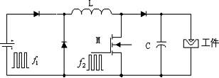 圖1為前、后級變換器的主電路圖。其中電容C的值很小,它的作用是高壓引弧放電。具體工作過程是這樣的:當(dāng)開關(guān)S關(guān)斷時,由于工件還處于開路狀態(tài),所以電感L中的大電流給C充電,致使工件兩端電壓線性急劇上升,直至高壓擊穿正常放電,此后,電流流經(jīng)工件進行加工,一直延續(xù)到S開通時結(jié)束。假設(shè)前級變換器的開關(guān)頻率為f1,后級電子負(fù)載開關(guān)S的開關(guān)頻率為f2,那么f1和f2有以下4種情況。