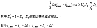 在t0時刻以前,S管開通,前級輸出短路,理想情況下,變壓器副邊輸出極窄的方波(Uo),當(dāng)t0時刻S關(guān)斷時,電流iL經(jīng)S換流至二極管D,給負(fù)載輸出電流。由于t0之前,前級變換器的占空比極小,突加負(fù)載后,由儲能電感給負(fù)載提供部分電流,隨著時間的延長,iL減小,受電流環(huán)的控制,前級變換器占空比增加,使iL回升至原值,故iL有一個波動過程。另外,如果電流環(huán)設(shè)計沒有達(dá)到最優(yōu)時,那么電流在調(diào)節(jié)過程中的超調(diào)量將很大,調(diào)節(jié)時間很長,致使加工電流不穩(wěn)定,影響加工效率和精度。但從S的一個開關(guān)周期看來,由于f1》f2,S的一個周期中,前級變換器將要經(jīng)歷多個周期,即當(dāng)S關(guān)斷時,前級變換器有足夠多的周期可以調(diào)節(jié)iL,使得iL穩(wěn)定。假設(shè)iL的允許波動范圍為ILmin~I(xiàn)Lmax,并假設(shè)f1在S關(guān)斷后經(jīng)過n個周期,進入穩(wěn)定狀態(tài),從能量的角度來看,即要保證在這n個周期中,當(dāng)前級變換器無輸出時,電感的儲能要滿足負(fù)載能量需求,這可用式(1)表示。