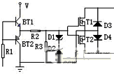 關(guān)互補(bǔ)電路實(shí)際上是繼電器的一個旁通電子開關(guān),采用兩只IGBT、兩只二極管構(gòu)成的交流通路,是互補(bǔ)式交流穩(wěn)壓器的主要技術(shù)點(diǎn),電路如圖3:
