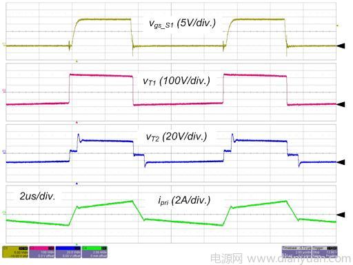 圖 4 和圖 5 所示為轉(zhuǎn)換器在標(biāo)稱輸入和全負(fù)載情況下的實(shí)驗(yàn)波形。S1 的柵極信號(hào),主變壓器的初級(jí)端和次級(jí)端的電壓和初級(jí)端電流如圖4所示。請(qǐng)留意這些波形與理論分析很好地吻合,包括ZVS 運(yùn)作。輸出電感電流和 SR 的電流如圖 5 所示,由于占空比和寄生組件,輸出電感電流是不均衡的,這意味著平均勵(lì)磁電流小于中心抽頭式配置(注 1)。