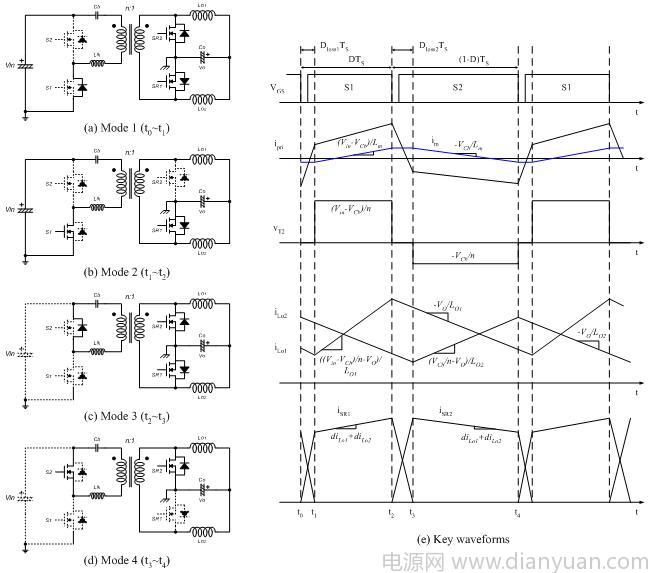 如圖 2 所示,從供電模式 2 開(kāi)始,由于 S1 開(kāi)啟,Vin-VCb 施加到變壓器的初級(jí)端,勵(lì)磁電流 im 以斜率 (Vin-VCb)/Lm.增加,由于 SR2 關(guān)斷,LO1 的電流斜率就由 (Vin-VCb)/n 減去輸出電壓決定。另一方面,LO2 的電流以斜率 –VO/LO2減小,這是流經(jīng) SR1 的續(xù)流 (free-wheeling)。當(dāng)兩個(gè)輸出電感分享負(fù)載電流時(shí),SR1 承擔(dān)全部負(fù)載電流。變壓器的次級(jí)繞組僅處理 iLO1 ,因而 iLO1/n 是反射到變壓器初級(jí)端的電流,它在勵(lì)磁電流上疊加,構(gòu)成初級(jí)電流 ipri。在實(shí)際上,由于漏電感的現(xiàn)象,所以 vT2 較圖 2 所示的數(shù)值稍低,但我們?cè)谶@一章段中將忽略這一情況,從而簡(jiǎn)化分析。