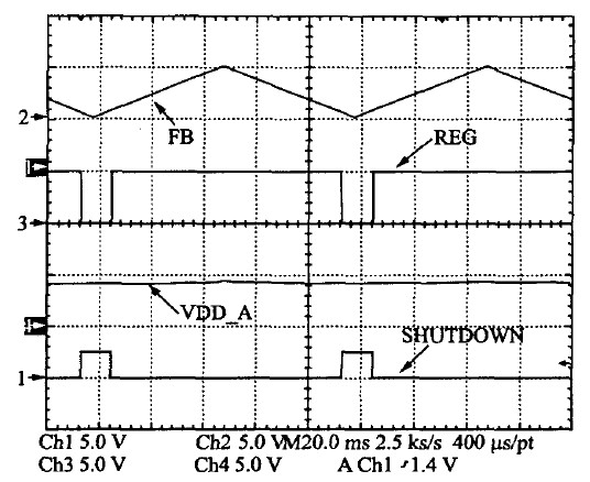 系統(tǒng)的多模式控制測試結(jié)果見圖13。中載或重載下系統(tǒng)采用PWM 模式工作,許多單元的供電電源為REG=5 V.極輕載條件下則關(guān)斷5 V的供電電源,減小系統(tǒng)的待機功耗,同時也有利于減小EMI和噪聲。其過程如下:當(dāng)FB電壓低于一個閾值時,待機模式選擇,則SHUTDOWN信號變高,關(guān)斷5 V 電壓源REG模塊,同時VDD-AD繼續(xù)給芯片供電,保證在輕載時芯片的檢測能夠連續(xù)實現(xiàn)。