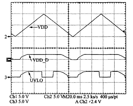 UVLO的啟動電流測量值僅為17.8 A,實現(xiàn)了系統(tǒng)的低啟動電流。系統(tǒng)上電和掉電的測試結(jié)果如圖11和圖12所示??梢娤到y(tǒng)在VDD的設(shè)置門限內(nèi)工作良好,REF-OK可以正確指示各個供電模塊正常工作。掉電過程正好相反。