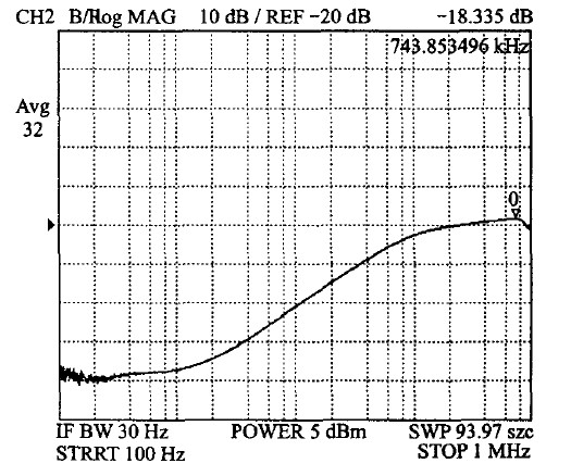 5 V 電壓的PSR測試波形如圖10所示。由此圖可見,其PSR可以達(dá)到-60 dB.該供電模塊在工作頻率為40~130 kHz的綠色多模式反激式控制器中的應(yīng)用表明,它對來自電源的干擾具有較好的抑制能力。