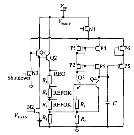圖5為5 V穩(wěn)定電壓源(REG)的電路原理。其中P1、P2、P3、P4組成共源共柵結(jié)構(gòu),可以提高電流鏡的鏡像精度,同時提高電源抑制比。Q3、Q4、R 1、R2組成一個帶隙基準(zhǔn)電壓,這樣可以減小額外的電流支路,降低功耗。Q1、Q2組成達(dá)林頓結(jié)構(gòu),增加輸出能力。P5、P6增加匹配,減小溝道長度調(diào)制效應(yīng)。Q1、Q2、R3、R4、R5、R6、Q4、P5、P6組成一個負(fù)反饋環(huán)路,將REG電壓穩(wěn)定在5 V。圖中C具有兩種作用:1、記憶直流工作點;2、補償環(huán)路電容。