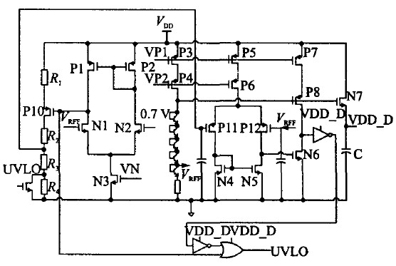 電路的工作原理可簡述如下:12 V供電電壓可在VDD比較低時建立一個PTAT (ProportiONal toabsolute temperature)電流源,然后利用其建立起帶隙基準(zhǔn)電壓源;當(dāng)VDD由0上升時,帶隙基準(zhǔn)電壓r首先建立,此時兩個比較器的輸出為低電位,P1導(dǎo)通,輸出為高電位;當(dāng)K1VDD大于 r時,COMP1輸出跳變,N1管導(dǎo)通,鎖存器鎖存上一個信號,UVLO為高電位(注意其為低電位有效);當(dāng)K2VDD大于VREF 時,N2導(dǎo)通,則UVLO-out為低電位,使能其他模塊;隨著VDD減小,K2VDD首先小于VREF,N2關(guān)斷,則鎖存器鎖存信號,UVLO-out保持;當(dāng) VDD減小到K1 VDD小于VREF時COMP1跳變,P1導(dǎo)通,N1關(guān)斷,則輸出UVLO-out為高電位,關(guān)斷整個控制芯片。