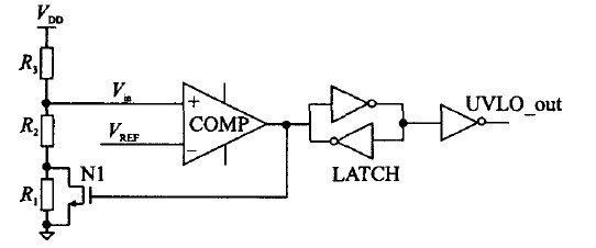時,比較器開始跳變,N1關(guān)斷,UVLO-out為0,使能整個控制芯片。當(dāng)外部電源電壓開始減小到: