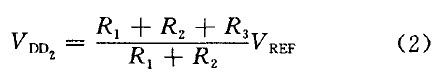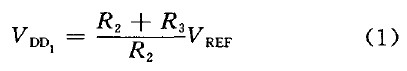時,比較器跳轉(zhuǎn),N1開通,UVLO-out開始變l.通過合理設(shè)置R1、R2、R3值就可以使VDD1=9.5 V,VDD2=7V,即VDD上升到9.5 V時UVLO輸出為零,芯片正常工作; VDD下降到7 V 時芯片停止工作。