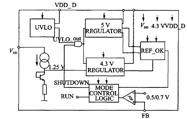 整個系統(tǒng)的構(gòu)成如圖1所示。系統(tǒng)中包括一個欠壓鎖定電路(UVLO,Under voltage lockout),用于保證電路在合適的電壓范圍內(nèi)正常工作;一個帶隙基準(zhǔn)電壓源和一個專為數(shù)字模塊供電的電壓源(記為VDD_D),分別為芯片提供基準(zhǔn)偏置和數(shù)字部分的電源。具體構(gòu)成時此兩模塊包含在UVLO模塊內(nèi)。兩個電壓調(diào)整器(REGULATOR)分別產(chǎn)生一個5 V和一個4.3 V 的穩(wěn)定電壓,其中5 V穩(wěn)定電壓源輸出記為REG,用于在重載時為控制器供電(輕載時關(guān)斷);4.3 V 穩(wěn)定電壓源輸出記為VDD_AD,用于輕載時的供電。當(dāng)然,必要時還可以利用帶隙基準(zhǔn)產(chǎn)生更多不同的電壓以滿足復(fù)雜控制模式的需要。
