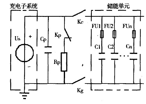 通常,充電子系統(tǒng)內(nèi)部配有過電流、過電壓和過熱等故障保護(hù)或異常告警裝置。但這些裝置的保護(hù)范圍一般僅限于充電子系統(tǒng)內(nèi)部,PPS放電時浪涌電壓等外部因素仍可能造成充電設(shè)備損壞。因此,在儲能單元和充電子系統(tǒng)間還需配置一些隔離和保護(hù)電路。圖1給出了用于ETCG研究的PPS所配置的充電隔離及保護(hù)電路。圖1中,充電隔離開關(guān)(Kc)和地絕緣隔離開關(guān)(Kg)在充電結(jié)束后打開,用以防止PPS放電時由負(fù)載等因素產(chǎn)生的浪涌高電壓通過充電子系統(tǒng)對地放電,可以避免因此所造成的充電設(shè)備絕緣損壞;充電輸出終端并聯(lián)了一小容量電容器(Cp)及其安全釋能電路(開關(guān)Kp、電阻Rp),目的在于防止空載誤充電,以避免在此情況下充電電路末端電壓急劇升高損壞充電設(shè)備。