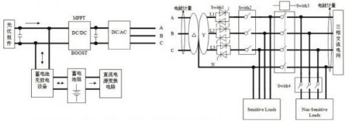 微網(wǎng)逆變器系統(tǒng)將可再生能源(如太陽(yáng)能,風(fēng)能,水能,地?zé)崮?,生物質(zhì)能等)轉(zhuǎn)變?yōu)榕c電網(wǎng)同頻、同相的交流電,優(yōu)先輸送給當(dāng)?shù)刎?fù)荷供電,剩余的電能饋入電網(wǎng)。微網(wǎng)逆變器系統(tǒng)主要包括:光伏組件、蓄電池組、蓄電池充放電設(shè)備、DC/DC變換器、微網(wǎng)逆變器、靜態(tài)開(kāi)關(guān)等。
