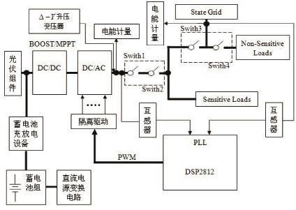 正常工作時(shí),開(kāi)關(guān)Switch1、Switch2、Switch3、Switch4同時(shí)閉合,為當(dāng)?shù)刎?fù)荷提供電能;當(dāng)出現(xiàn)電網(wǎng)缺相、電壓嚴(yán)重跌落等非正常狀況時(shí),由DSP檢測(cè)出異常情況,做出判斷決策,并控制開(kāi)關(guān)的開(kāi)通與0關(guān)斷。這時(shí),開(kāi)通Switch1和Switch2,關(guān)斷Switch3,保證重要負(fù)荷的供電。當(dāng)逆變器發(fā)生故障時(shí),立即斷開(kāi)Switch1,逆變器退出,同時(shí)斷開(kāi)Switch4,由電網(wǎng)對(duì)重要負(fù)荷供電。當(dāng)逆變器故障消失時(shí),在與電網(wǎng)同步后,開(kāi)通Switch1,再閉合Switch4,恢復(fù)對(duì)當(dāng)?shù)刎?fù)荷的供電。當(dāng)需要檢修逆變器時(shí),先斷開(kāi)開(kāi)關(guān)Switch2,檢修完成后,重新閉合Switch2。