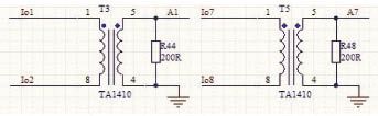 此系統(tǒng)輸出電流小于1A,故選擇最大可以測(cè)量1A的電壓型電流互感器TA1410,負(fù)載電阻用是200歐,輸出電壓為-1V~1V的交流電壓。電路如圖4所示。