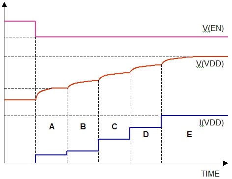 在A部分,通過限制流過分斷開關(guān)的電流來減少負載電容充電時的浪涌電流;在B部分,升壓轉(zhuǎn)換器的開始電流限制在25%;在C部分,電流限制設(shè)在50%;在D部分電流限制為75%;在E部分,電流限制為100%。
