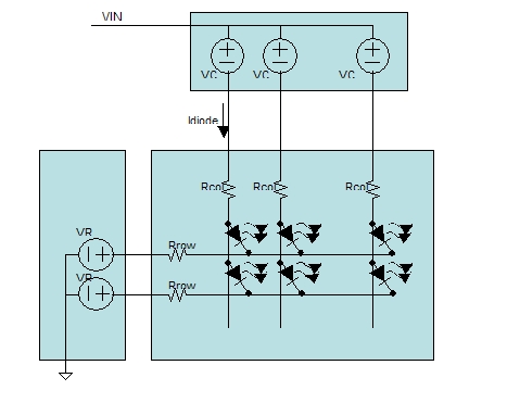 其中:V二極管是二極管的前向壓降;I二極管是流經(jīng)二極管的電流;Rcol是列連接的電阻;Rrow是行金屬的電阻;VCD是列驅(qū)動器所需的開銷;VRD是行驅(qū)動器所需的開銷;在典型應用中,VIN大約為20V。