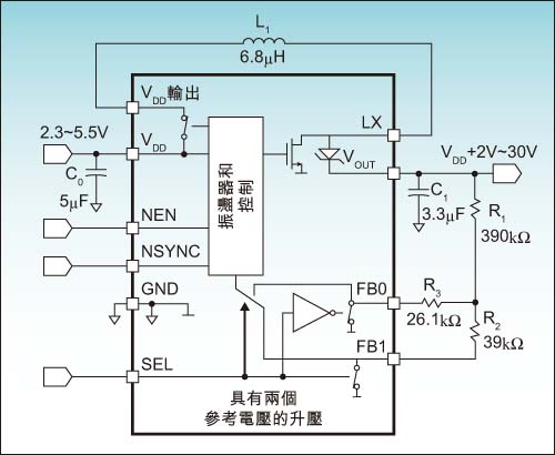 典型的反饋電壓是1.15V±2%。當選擇引腳(SEL)設(shè)置為低時,F(xiàn)B0反饋引腳就與參考電壓進行比較,F(xiàn)B1引腳接地,用以提供反饋參考地。當SEL為高時,F(xiàn)B1用作參考電壓,F(xiàn)B0接地。輸出電壓可用公式5和公式6計算:
