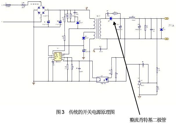 首先,從供電電源來看,如圖3是一個傳統(tǒng)的開關(guān)電源原理圖,如果要將5V降為4V,整流肖特基正向壓降所占輸出電壓比重必然增加,開關(guān)電源輸出電壓越低,因整流肖特基正向電壓比重越高(其比重X=V壓降/V輸出,輸出從5V降為4V,加入其壓降為0.5V,則其比重將從0.1上升為0.125,提高25%),電源輸出效率就越低,這對于LED屏幕整體節(jié)能效果并不明顯,所以采用這一電源設(shè)計原理顯然是是無法實現(xiàn)電源工作效率的提升。同時,5V是標(biāo)稱值電壓,在市場運(yùn)用上已經(jīng)相當(dāng)成熟,啟用新的開關(guān)電源電源電壓,降低效率的同時只會增加成本,品質(zhì)也難保障,實現(xiàn)有困難。